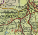 Dorking is located 13 miles east of Guildford, set among the Surrey Downs. An ancient market town, lying where the old Pilgrim's Way met the Roman Stane Street, Dorking now serves as a dormitory town for the many London commuters, with a population of around 25,000. The map below shows the features of the town of Dorking as it was in the mid twentieth century. Click on a selected area of the map below to see an enlargement.